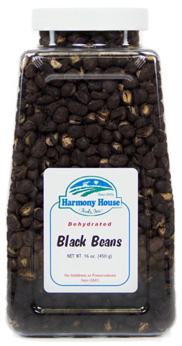 Harmony House 16 oz Jar of Dehydrated Black Beans All Harmony House Foods ship for a flat flee of $7.95! Anything over $99.00 Ships FREEDisasternecessities presents Harmony House Food. Good source of protein! Our JAR contains a FULL QUART of fresh product. Using a unique patented process, our beans & legumes are sorted, washed, soaked, and gently processed to take all the work out of bean preparation. No more boil overs, burnt pots, cleaning, washing, or soaking! Our beans and legumes are easy to store too! No heavy cans to handle and store. When you're ready to use them in a recipe, just put about 1/2 the amount of beans called for into your cooking container, simmer until tender (10-15 minutes), and serve. That's it! Remember to keep some in your emergency food kit. 4 ounces of Dehydrated Beans equals the equivalent amount of beans you get from one 16 ounce can. No additives or preservatives. Non-GMO. Ingredients: "True Dehydrated" Black Beans