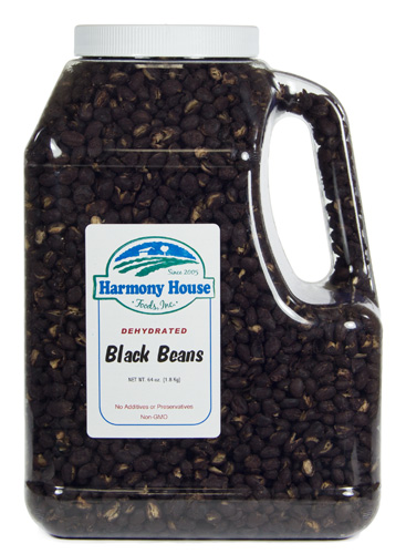 Harmony House 4 lb Jug of Dehydrated Black Beans All Harmony House Foods ship for a flat flee of $7.95! Anything over $99.00 Ships FREEDisasternecessities presents Harmony House Food. Good source of protein! Our JUMBO JUG contains a FULL GALLON of fresh product. Using a unique patented process, our beans & legumes are sorted, washed, soaked, and gently processed to take all the work out of bean preparation. No more boil overs, burnt pots, cleaning, washing, or soaking! Our beans and legumes are easy to store too! No heavy cans to handle and store. When you're ready to use them in a recipe, just put about 1/2 the amount of beans called for into your cooking container, simmer until tender (10-15 minutes), and serve. That's it! Remember to keep some in your emergency food kit. 4 ounces of Dehydrated Beans equals the equivalent amount of beans you get from one 16 ounce can. No additives or preservatives. Non-GMO. Ingredients: "True Dehydrated" Black Beans