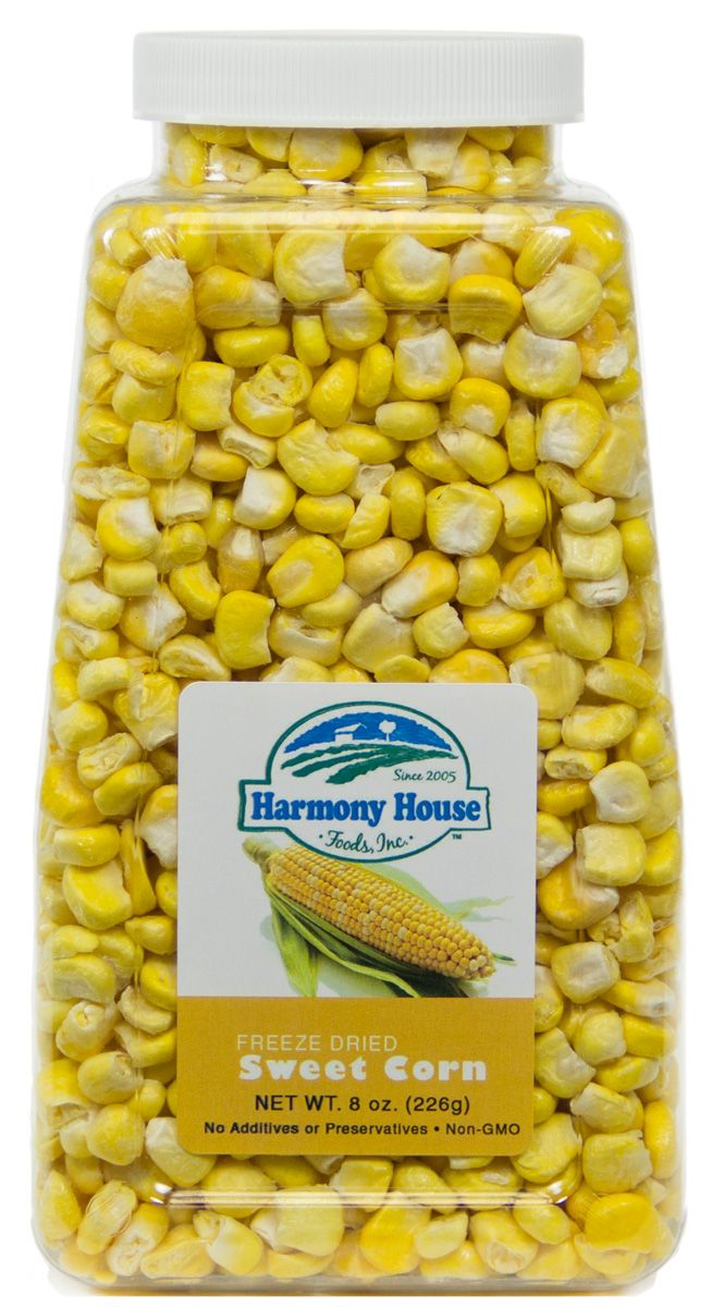 Harmony House 8 oz Jar of Freeze Dried Corn, Super Sweet All Harmony House Foods ship for a flat flee of $7.95! Anything over $99.00 Ships FREEDisasternecessities presents Harmony House Food. Try a FULL QUART SIZE container of our special FREEZE DRIED Super Sweet Corn (whole kernel). These light and airy kernels are ready to use right out of the jar. They rehydrate quickly with hot water, reducing your need of fuel when backpacking. They are delicious right out of the container as a wholesome snack. We love these! No additives or preservatives. (Ingredients: Freeze Dried Corn) Description & Directions: Freeze Dried Super Sweet Corn is ready to eat or use in quick cooking dishes. 1 pound of freeze dried corn replaces 4 pounds of fresh. Storage & Shelf-life: Store in original container in a cool, dry location, for 18 months. You may also reseal product in a vacuum type storage bag for extended storage. Savor the Taste of Summer with Disasternecessities Harmony House Freeze Dried Sweet CornWhat is Freeze Dried Sweet Corn?Savor the taste of summer with freeze dried sweet corn. The delicious golden taste captured in each kernel summons sweet memories of summer picnics and corn roasts! Our freeze dried sweet corn is preserved through an instantaneous drying process called “freeze drying." It varies from the dehydration process because it allows the corn to maintain its molecular shape. Freeze dried vegetables are popular due to their ability to rehydrate almost instantly when you add water. Stock up and feel the warmth of summer when you add freeze-dried sweet corn to your dishes, year round. A Delicious Addition to Any MealFreeze dried sweet corn is a delicious addition to any meal and is super easy to prepare. Simply rehydrate by adding one cup of water for every one cup of product. Heat, season to desired taste, and enjoy! You can also use freeze dried sweet corn in any recipe that calls for corn. Let it be the star in your favorite corn chowder recipe or a subtle addition to a black bean chili. If you’re looking for a quick and healthy snack, freeze dried corn can even be eaten dry, straight out of the jar! There are so many uses for freeze dried corn. What will you use it for? A Fresh Bounty of Freeze Dried FoodsFreeze dried foods make cooking so easy! If you like freeze dried sweet corn, be sure to try some of our other freeze dried products. Expand your cooking potential with freeze dried peas, mushrooms, soybeans and celery. In addition to our vegetables, we also offer a whole line of freeze dried fruit including apples, strawberries, blueberries, pineapple, mangoes, sliced peaches, and more. Freeze dried fruits are a delicious addition to cereal and smoothies, and can be enjoyed straight out of the jar! Baking connoisseurs will enjoy the delightful burst of flavor in their pastries when they throw in some freeze dried fruit powder. Once you discover the joys of cooking with freeze dried food, you’ll never want to go back. Freeze dried foods make your life simpler by giving you easy, quick, and healthy food choices right at your fingertips! We'd love to help you place your order. Give us a call at 1 (435) 503-4169 today. Harmony House Foods from Disasternecessities!