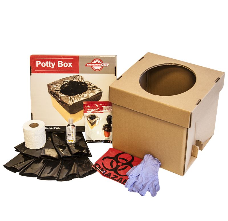 Emergency Zone Potty Box Urban Toilet Sanitation SetWhen living in smaller homes or apartments, storing food and water for emergencies can be a challenge in and of itself. Adding to this, first aid, hygiene, flashlights, radio, and others could make emergency preparedness seem like an impossible task. Potty Box - Complete Toilet Sanitation Set was designed with this challenge in mind. Folding down to less than 4 inches tall, the entire kit is compact enough to fit under beds, desks, and in the car.