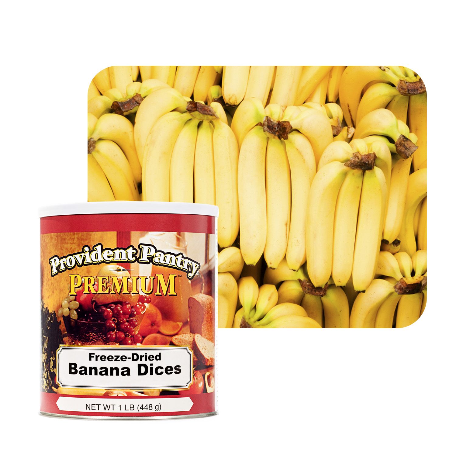 Freeze Dried Banana Dices Provident Pantry - 16 OuncesDisasternecessities: Value. Quality. Service. Disasternecessities presents the great tasting, high quality, low price Long Term Food Storage. Our delightfully sweet Provident Pantry® freeze dried banana dices are processed and packaged for long-term storage, so you can enjoy the natural goodness of fruit now or in the years to come. Add flavor and variety to your emergency food storage. Re-hydration restores much of the original flavor and size. Great as a natural sweetener in cereals. Also add to smoothies, baked goods, pancakes, or eat as a snack. Ingredients: Banana Dices. No additives or preservatives.