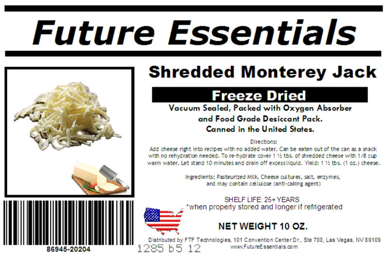 Future Essentials Freeze Dried Shredded Monterey Jack Cheese Case of 12 Small Cans FREE SHIPPING on all Future Essentials Food CasesDon’t get caught in an emergency without being prepared! Disasternecessities presents the high quality, low price, great value safety and protection Long Term Food Storage from Future Essentials! #2.5 Can / 10oz. This is REAL grated Monterey Jack cheese, and will melt after you rehydrate it. Future Essentials Freeze Dried Monterey Jack cheese can be used in many recipes including casseroles, pizza, soups, chili, and salads. 1 part freeze dried=2 parts fresh prepared. Proudly using USA dairy, as well as canned and prepared in the states. Directions: Add cheese right into recipes with no added water. Or rehydrate in a little warm water prior to use. Can be eaten out of the can as a snack with no rehydration needed. (Directions are on label) Shelf Life: 25+ Years Ingredients: Pasteurized Milk, Cheese cultures, salt, enzymes, and may contain cellulose (anti-caking agent) * Contains dairy. LOW PRICE! FAST SHIPPING! QUALITY FOOD!