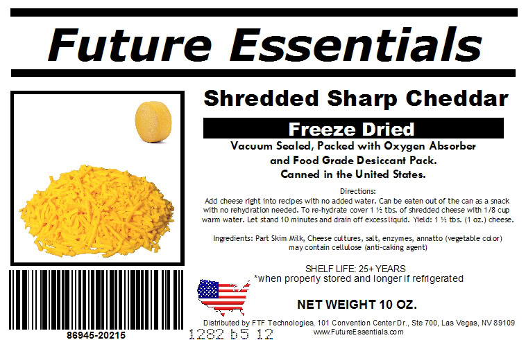 Future Essentials Freeze Dried Shredded Sharp Cheddar Cheese Case of 12 Small Cans FREE SHIPPING on all Future Essentials Food CasesDon’t get caught in an emergency without being prepared! Disasternecessities presents the high quality, low price, great value safety and protection Long Term Food Storage from Future Essentials! #2.5 Can / 10oz This is REAL grated Sharp Cheddar cheese, and will melt after you rehydrate it. Future Essentials Freeze Dried Cheddar cheese can be used in many recipes including casseroles, tacos, soups, chili topping, and salads. Fresh weight replacement 1 to 4 (freeze dried - fresh prepared). Proudly using USA dairy, as well as canned and prepared in the states. Directions: Add cheese right into recipes with no added water. Or rehydrate in a little warm water prior to use. Can be eaten out of the can as a snack with no rehydration needed. (Directions are on label)