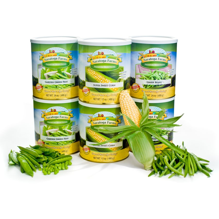 This is a great mix of nutritious vegetables all in one package! If a natural disaster or personal crisis ever happens, it could be difficult both to find and to cook healthy food. This Saratoga Farms Vegetable variety pack means you will always have access to fresh tasting nutritious vegetables like super sweet corn, garden fresh peas, crisp green beans in to keep your family satisfied. What's In The Box? Vegetables (6 cans | 144 Servings): 2 cans Super Sweet Corn
