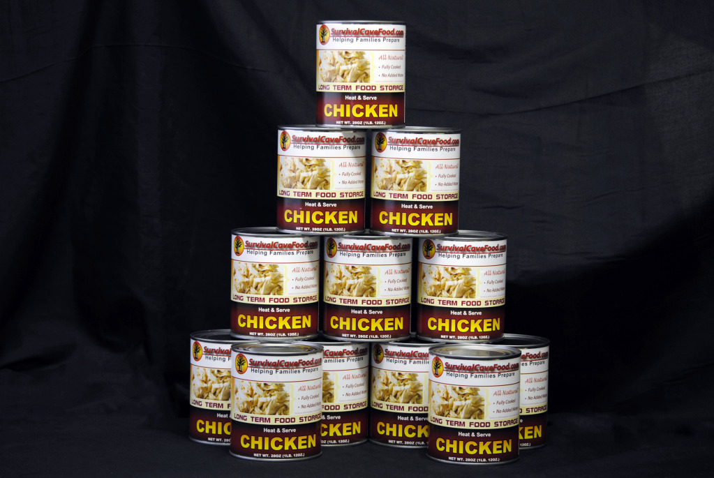 Chicken (canned) for Food Storage by Survival Cave Food - 12 CansDisasternecessities presents this protein rich canned chicken (no water... no broth added!) by Survival Cave Food is considered revolutionary for it's Long Term Storage capabilities. It is cooked with slow pressure at a low 240 degree heat and has absolutely NO EXPIRATION DATE! (How about THAT!) We suggest that each can be rotated (open and eaten) every 10-12 years, but tests have shown that the canned meats maintain their nutrition much longer (up to 35 years are still good!). Each case of 12 cans contains 108 servings (9 servings per can). It's pure meat, with no MSG, or any other strange chemicals or additives. Very little salt (sodium), very low in fat, and made with USDA inspected meats. And you want your food storage to come from the USA? Not foreign? Well Disaster Necessities delivers: Our meats are 100% from the USA. LOW PRICE GUARANTEE! WE WILL NOT BE UNDERSOLD!