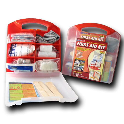 Bandages-Minor Cuts & Scrapes 30 - Adhesive Bandages (3/4"x3") 30 - Adhesive Bandages (1" x3") 30 - Adhesive Bandages (3/8"x1 3/4") 3 - Knuckle Bandages 1 - 2"x3" Extra Large Strip 3 - Butterfly Closures Injury Treatment Wound Preparation: 1 - Eye Pad 4 - Gauze Pads 4"x4" (2 per pack) 4 - Gauze Pads 3"x3" (2 per pack) 4 - Gauze Pads 2"x2" (2 per pack) 1 - 2" Rolled Gauze 1 - 3" Rolled Gauze 1 - Gauze Trauma Pad (5"x9") 10 - Alcohol Cleansing Pads 20 - Antiseptic Towelettes 20 - Cotton Swabs 1 - Adhesive Tape Roll Sprains & Bruises 4 - Finger Splints 1 - 2" Elastic Bandage 1 - 5"x 6 " Instant Cold Pack Instruments & First Aid 2 - Tweezers 4 - Examination Gloves (Bagged) 1 - Filtration Mask 1 - First Aid Guide 2 - Disposable Splinter Removers (Lancets) 1 - Reusable Case w/ Wall Mountable Bracket